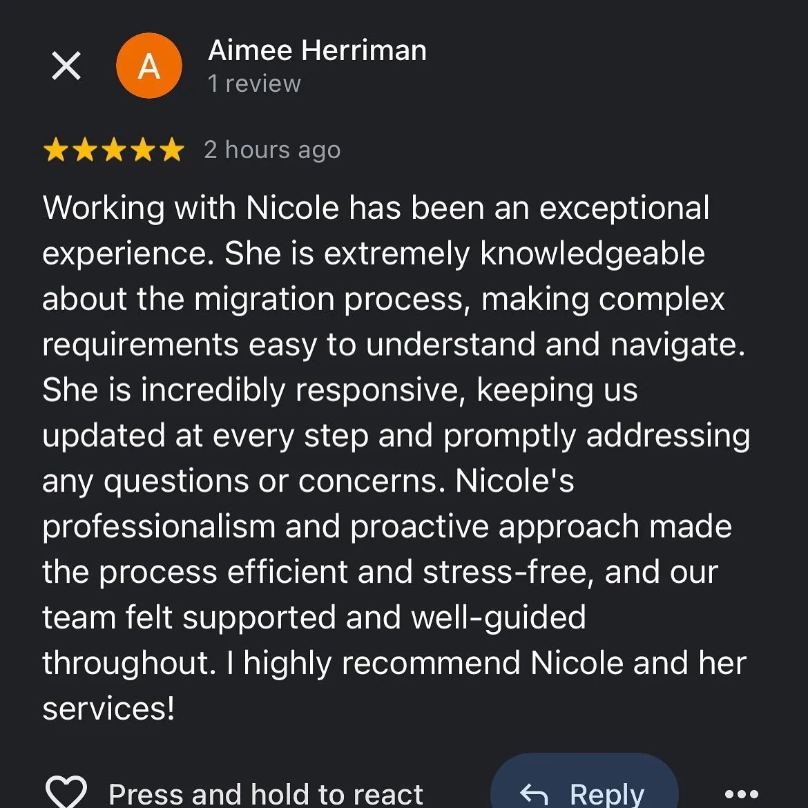 "I had an outstanding experience with Nicole. Her professionalism, personalised approach, and excellent communication made the entire process smooth and stress-free. Her expertise and positive attitude set her apart from other agents I have dealt with in the past. I highly recommend Aussie Migration's services!